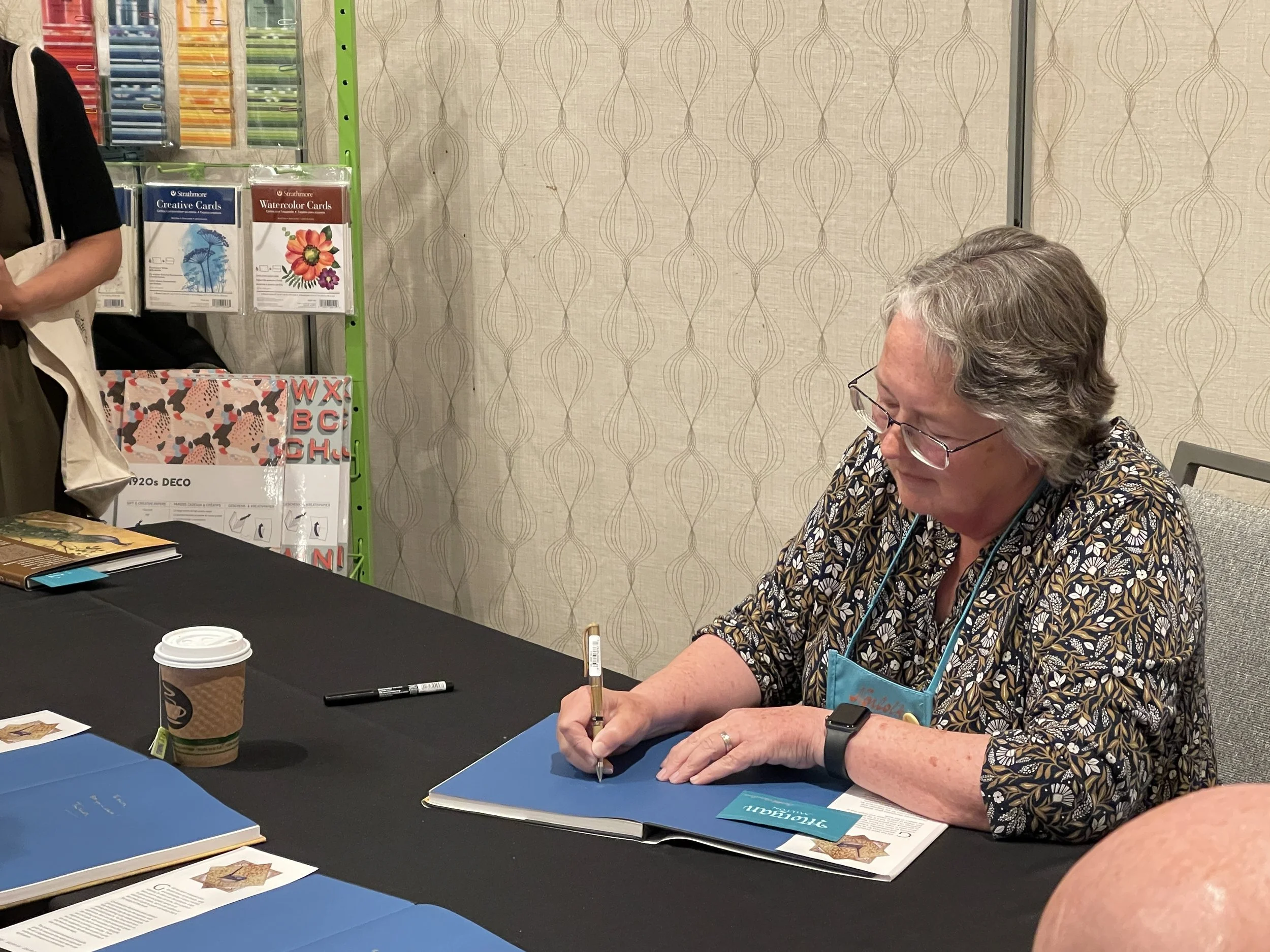 Famed British illuminator Toni Watts, signing her new book, “Contemporary Illumination” at Iampeth 2025, also to be reviewed.